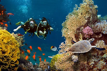 Les plongeurs utilisent des masques pour observer la biodiversité aquatique. Cette approche silencieuse préserve la tranquillité de la faune évoluant près du récif corallien.
