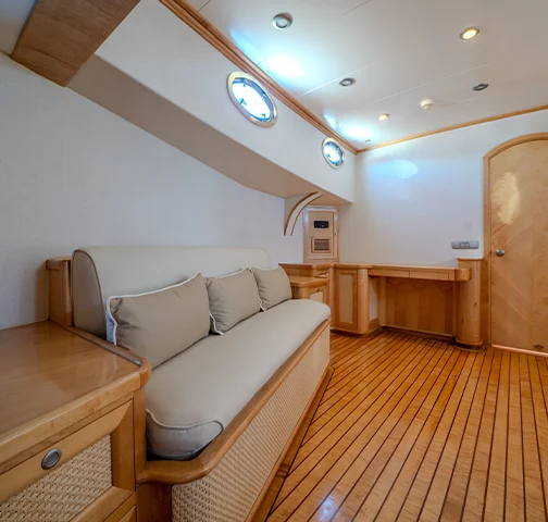 Au cœur du paquebot, les cabines bénéficient de balcons suspendus offrant une vue dégagée sur l’horizon marin. Les suites intègrent des salons privatifs spacieux, tandis que le mobilier modulable optimise l’espace de circulation durant toute la traversée.